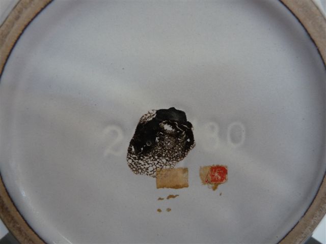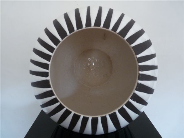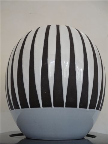 Ballonförmige, teils glasierte Keramik Vase mit elliptischen Schwarz-Weiß Streifen Unten in Hellgrau abgesetzt