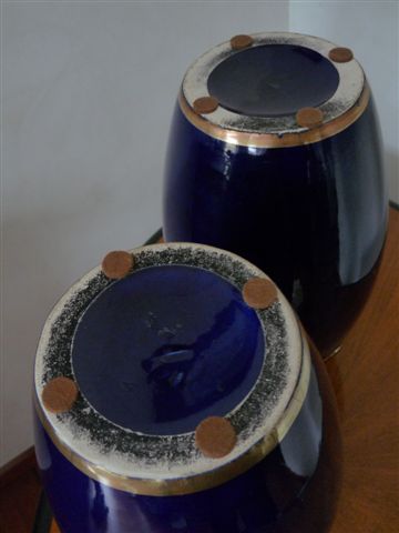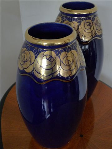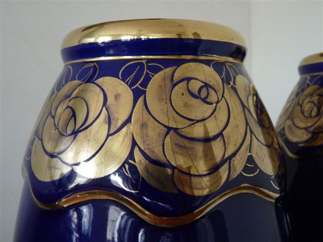 Glasierte Keramik Vasen in Kobalt Blau mit goldenen, handbemalten Blumendekor Ungemarkt