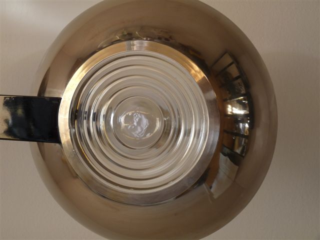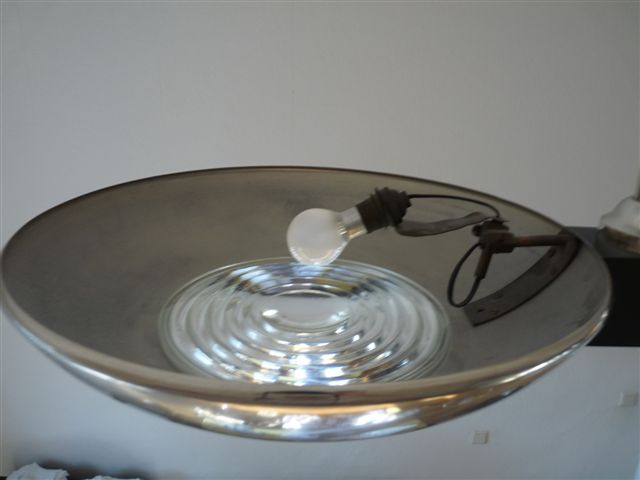 Doppelt nebeneinander angelegte, vernickelte Pfannenförmigen Schalen mit schweren, abnehmbaren Scheinwerfer-Stufenlinsen.