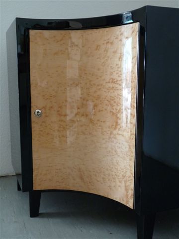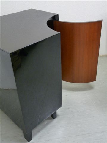 Korpus Nussbaum, Schwarz Hochglanzlack Konkav gekrümmte Tür, Ahornfurnier Klarlack. 1 Einlegeboden